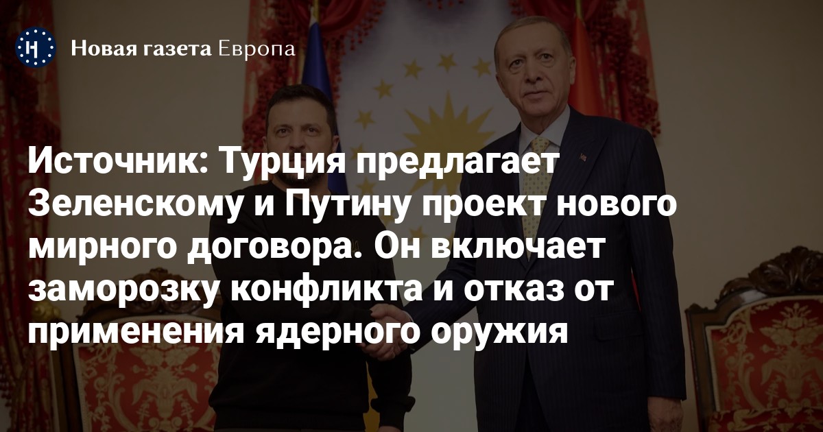 Редакции «Новая-Европа» удалось узнать о существовании нового проекта договора, который заморозит войну между Россией и Украиной. Согласно источнику, познакомившемуся с документом, он продвигается при посредничестве президента Турции Реджепа Эрдогана и является инициативой турецкой стороны.
