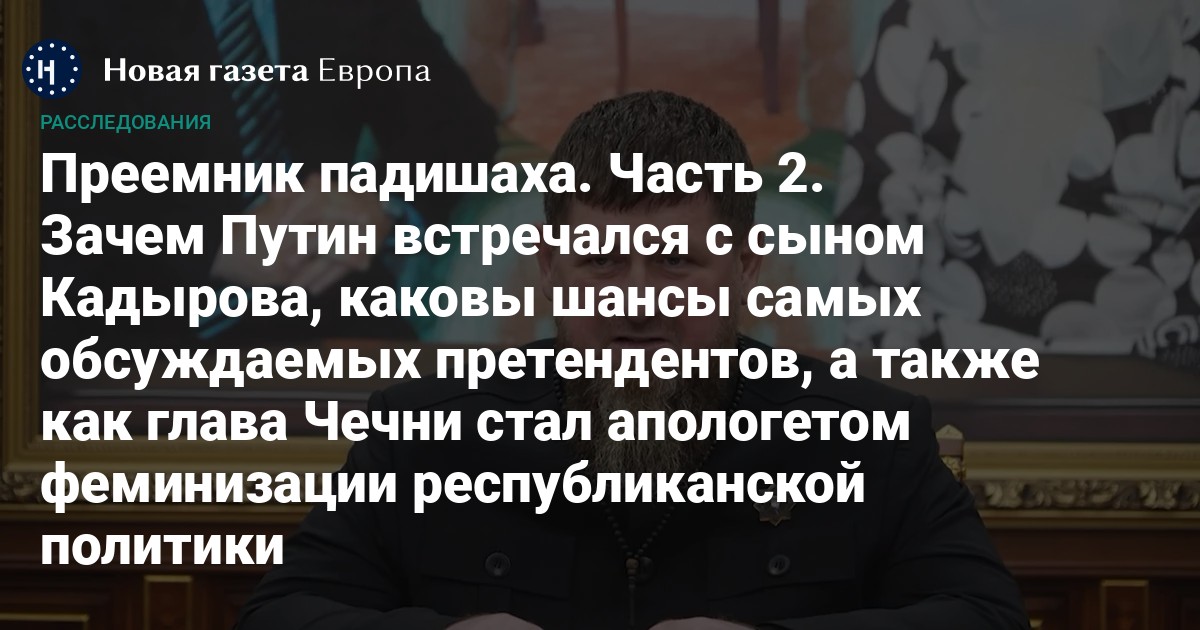 В новой же серии нашего исследования мы расскажем, как Кадыров в понимании Кремля стал главным фактором дестабилизации Чечни. Оценим шансы самых обсуждаемых кандидатов в преемники: сыновей Кадырова, его племянника и республиканских политических грандов. А также рассмотрим влияние сестер и дочерей чеченского главы на политику внутри и за пределами региона.