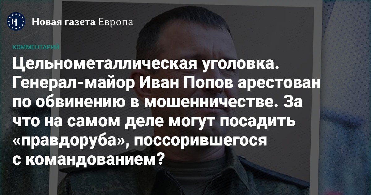 — Я считаю арест Попова следствием его демарша против руководства Генерального штаба, который он позволил себе прошлым летом, — говорит «Новой-Европа» специальный корреспондент Русской службы Би-би-си Илья Барабанов. — Состав, который инкриминируют военачальнику, вызывает вопросы. Когда мы читаем о том, что у генерал-майора найдено всего имущества на 6 млн рублей, то понимаем, что он не заработал даже на однокомнатную квартиру в Москве.