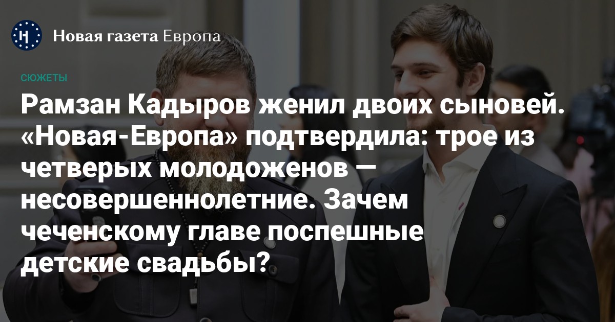 По данным источников «Новой газеты Европа», 8 июня в Чеченской республике состоялись свадьбы двух сыновей Кадырова — 17-летнего Эли Кадырова и 16-летнего Адама Кадырова. В отличие от пышной свадьбы старшего сына главы Чечни Ахмата, отгремевшей в марте прошлого года с вызывающей демонстративностью, в этот раз торжества прошли в обстановке беспрецедентной секретности. Кажется, было сделано все, чтобы пресечь даже малейшую возможность утечки информации.