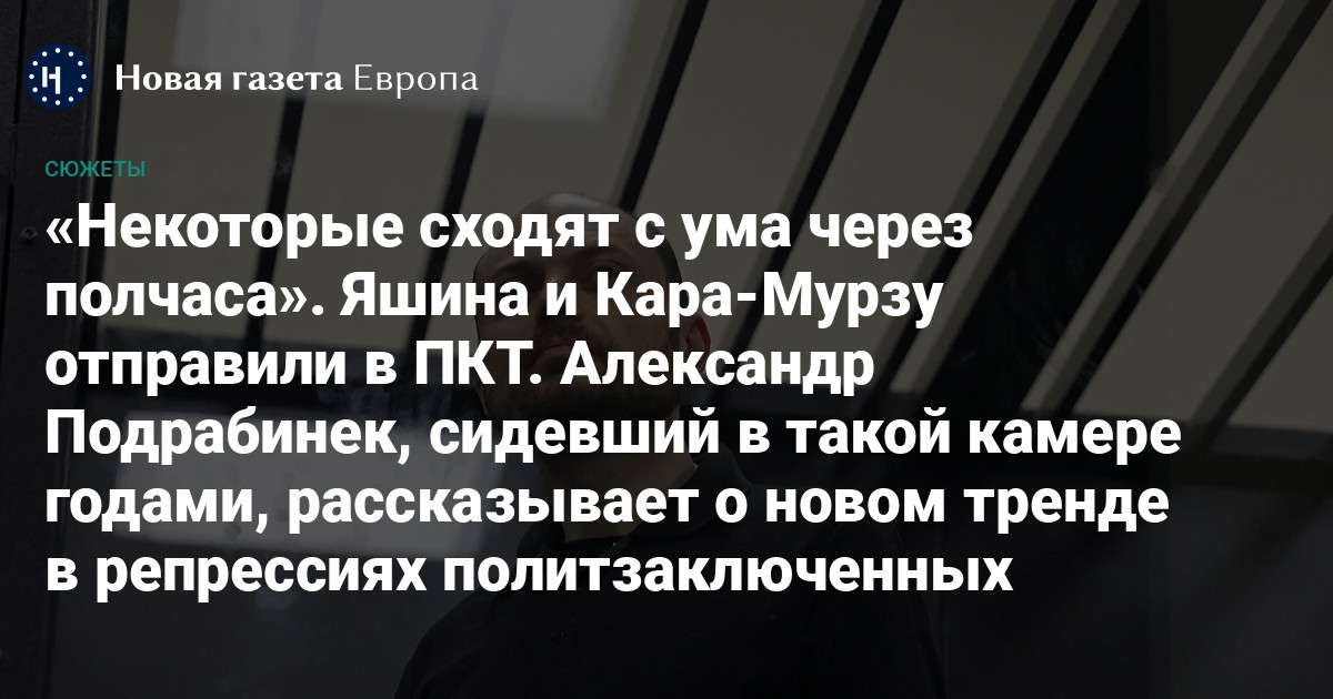 На этой неделе сразу двух осужденных представителей российской оппозиции — Владимира Кара-Мурзу и Илью Яшина — отправили в ПКТ. Первому суждено полгода провести в одиночной камере ПКТ при колонии строгого режима в Омске — за то, что в течение нескольких секунд держал руки не за спиной, когда подошел к месту, куда по внутренним правилам было необходимо положить шапку. Второй два месяца проведет в ПКТ при колонии общего режима в Смоленской области — за то, что после выхода из душевой на пару минут снял робу, чтобы переодеться.