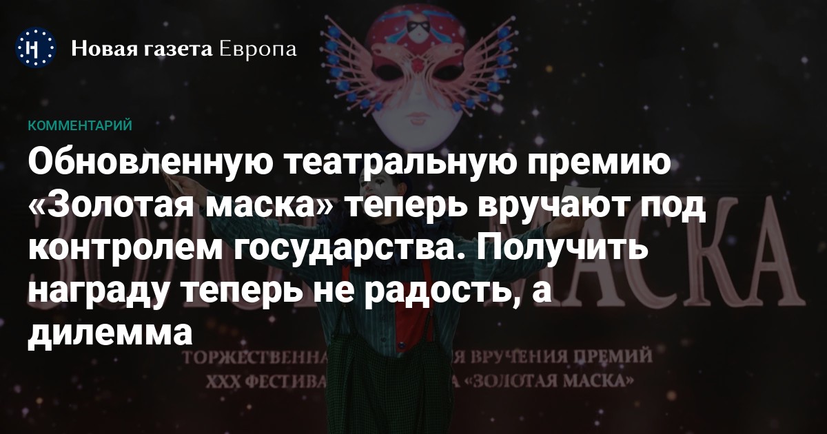 Летом следующего года государство всё-таки решило с этим покончить. «Маску» реорганизовали, главой Союза театральных деятелей (и главой «Золотой маски», плюс худрук «Табакерки» и с недавних пор худрук «Современника») стал человек удивительной эффективности, судя по количеству мест работы — Владимир Машков. А прошла новая церемония на сцене Театра им. Вахтангова, чтобы другой эффективный театральный менеджер Кирилл Крок мог продемонстрировать свою эффективность. Крок не так давно уже кое-что продемонстрировал: отменил вечер памяти Римаса Туминаса и публично поддержал свидетеля обвинения Карпука, сообщившего во время дачи показаний в процессе по тому самому «Финисту», что не знает, кто такой Валерий Гергиев (в какой-то момент Гергиев, кстати, предложил не номинировать себя на «Золотую маску», чтобы не забирать очередную; теперь же он вместе с Машковым рассказывает о ее обновлении в эфире «Первого канала») или кто такая Полина Агуреева.