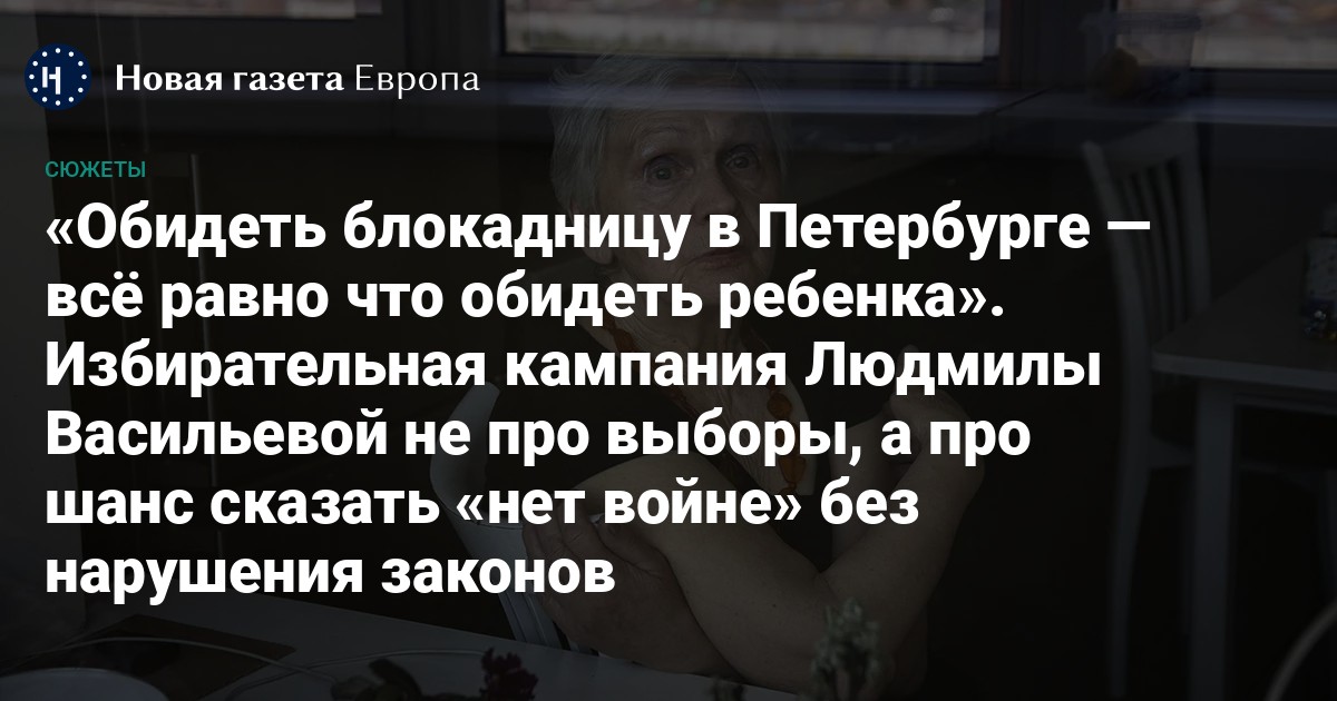 — Действующие власти, особенно губернатор Беглов, сейчас оказались в щекотливой ситуации, — прокомментировала в интервью «Новой газете Балтия» Наталья Евдокимова, член движения «Европейский Петербург», ответственный секретарь Правозащитного совета Петербурга. — С одной стороны, в центре Северной столицы некая самовыдвиженка, являющаяся оппонентом Беглова на этих выборах, прямо, откровенно, не стесняясь в выражениях, не сдерживая себя, ведет антивоенную агитацию. А с другой стороны, ей 83 года, она всю жизнь прожила в городе, она блокадница, ветеран труда. Обидеть блокадницу в Петербурге — это всё равно что обидеть ребенка.