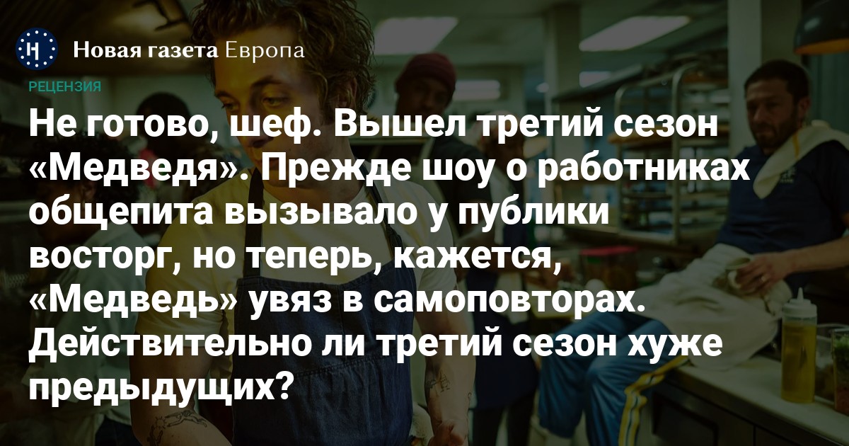 С тех пор, как на Hulu дебютировала инди-драма «Медведь», прошло всего два года. Изначально задуманный как мини-сериал, экспериментальный проект Кристофера Сторера посвящен будням заурядной чикагской сэндвичной, с трудом сводящей концы с концами. По сюжету видный шеф-повар Кармен «Карми» Берзатто наследует семейное кафе The Original Beef, доставшееся ему от покончившего с собой брата Майкла. Сотрудники забегаловки не жалуют нового босса, пытающегося привить им порядки высокой кухни. Каждая рабочая смена оборачивается руганью, пока однажды точка кипения не достигает критической отметки.