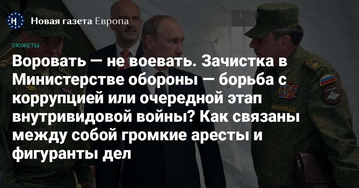 Волна арестов, проводимая уже несколько месяцев в Министерстве обороны РФ, коснулась многих высокопоставленных военных. Среди арестованных — два заместителя министра, несколько генералов и влиятельных чиновников. «Новая-Европа» вспоминает громкие уголовные дела против чиновников, связанных с российской армией, и разбирается в том, можно ли считать антикоррупционную кампанию реальной борьбой с воровством или мы очередной раз наблюдаем войну кланов силовиков.