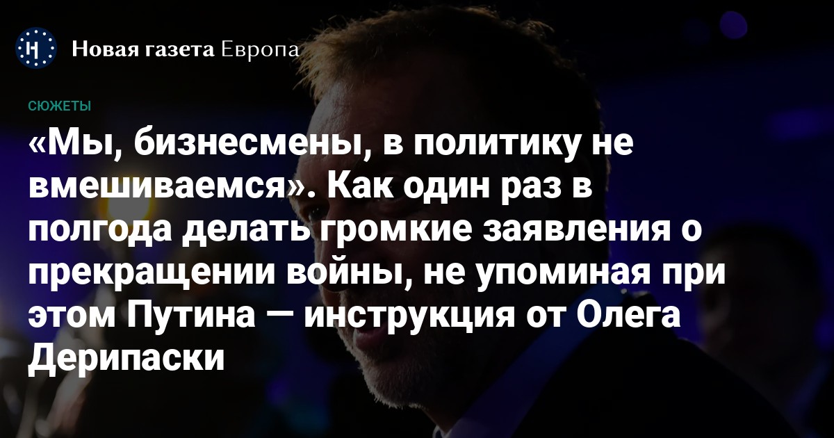 По версии Дерипаски, в кровопролитии виновата некая мифическая субстанция, а остановить войну должны Украина и Америка. Последняя, к слову, у олигарха давно вызывает боль: путь туда Олегу Дерипаске оказался закрыт еще до войны. А после войны путь закрыли и в Евросоюз, и в Великобританию. Раз в полгода бизнесмен дает интервью, осуждая войну, но не осуждая Путина и упрекая США в военной помощи Украине. Попытки Дерипаски усидеть на двух стульях — снять персональные санкции и не испортить отношения с Кремлем, увы, пока наталкиваются на непонимание европейских и американских чиновников (возможно, в том числе и потому, что в своем телеграм-канале бизнесмен не раз называл их «мудачьем»).