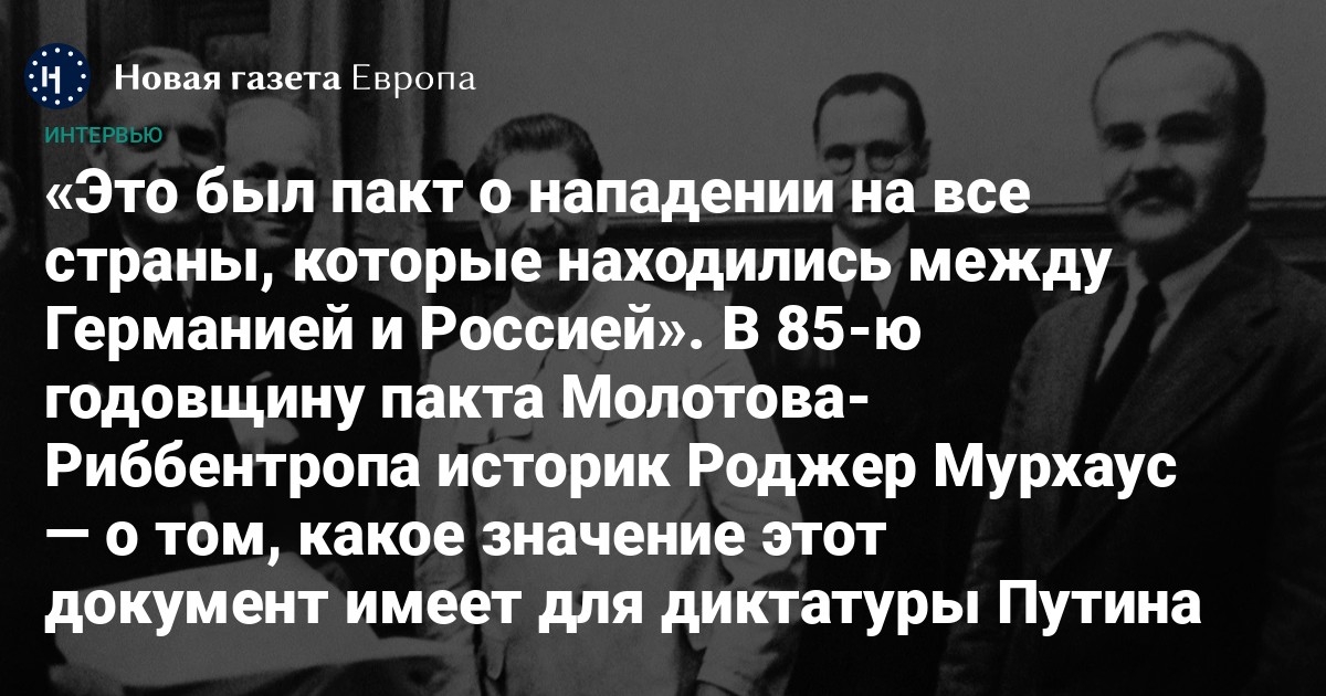 23 августа 1939 года, 85 лет назад, главы иностранных ведомств сталинской России и нацистской Германии подписали договор о ненападении. К договору прилагался секретный протокол, в котором Берлин и Москва разделили «сферы влияния» в Европе. Если лидеры СССР до последнего момента отрицали сговор с Гитлером, то Владимир Путин, 15 лет называвший пакт «аморальным», теперь фактически им гордится. Британский историк Роджер Мурхаус, написавший о пакте Молотова-Риббентропа книгу «Дьявольский союз», рассказал специальному корреспонденту «Новой газеты Европа» Илье Азару о том, почему договор стал снова актуален спустя 85 лет, каким он видит окончание войны в Украине, должен ли был Запад пойти на новое «Мюнхенское соглашение» с диктатором и может ли Россия рассчитывать на демократизацию.