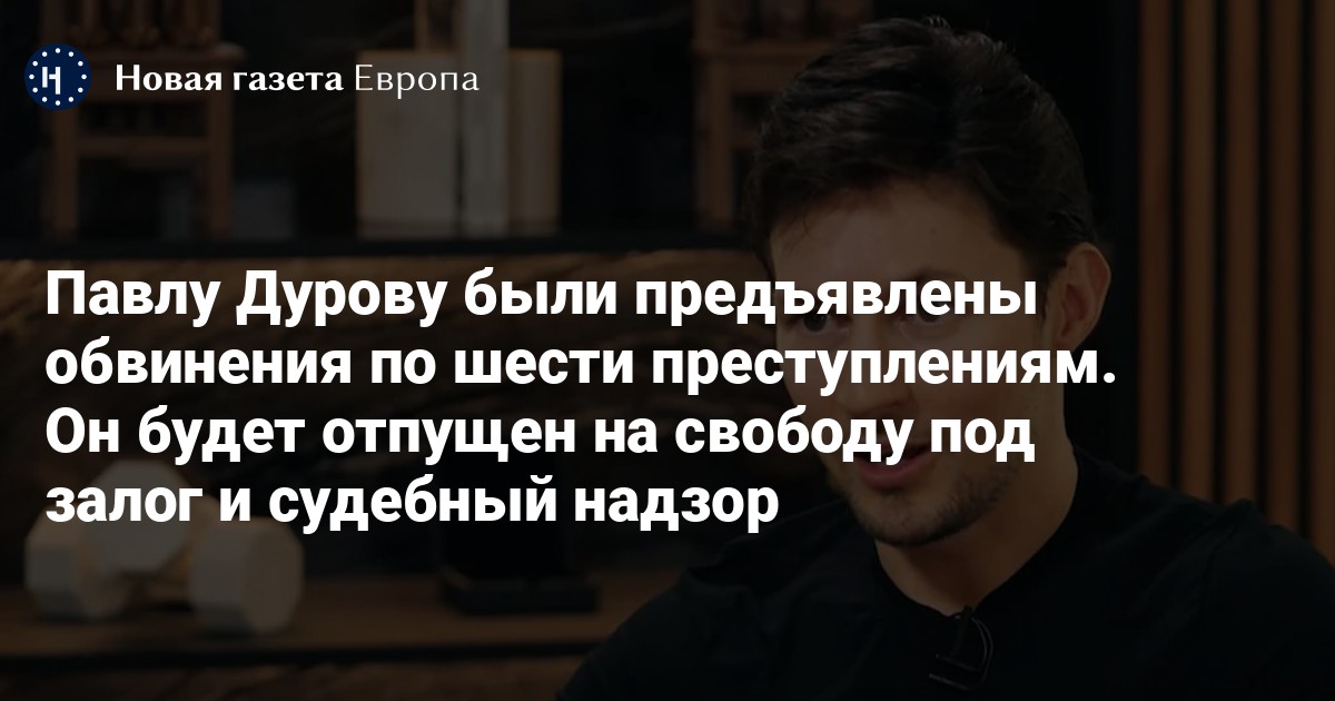 Павлу Дурову были предъявлены обвинения по шести преступлениям. Он будет отпущен под залог. Об этом говорится в пресс-релизе прокуратуры Франции, который получила «Новая-Европа».