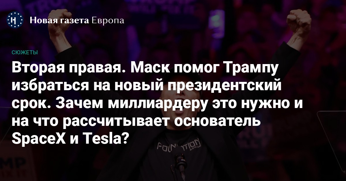 До победы Трампа Маск в шутку заявил, что его могут посадить за решетку, если выиграет Камала Харрис. После выборов миллиардер, очевидно, чувствует себя в безопасности. В следующие четыре года его будущее кажется безоблачным. Что ожидает Маска потом, покажет время.