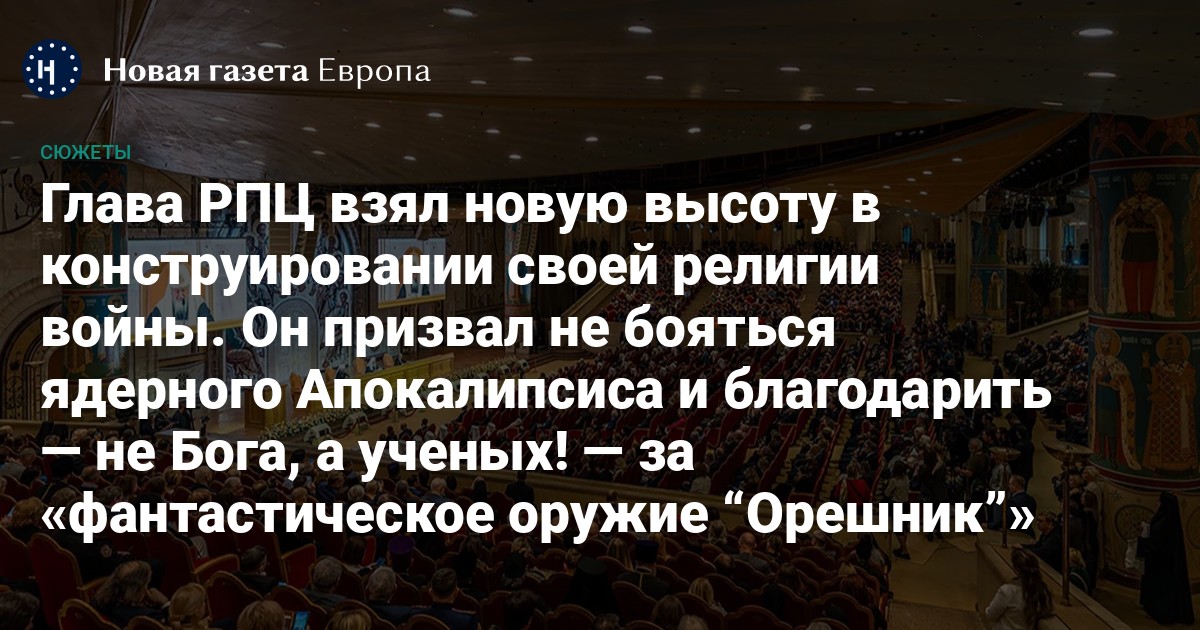 Глава РПЦ взял новую высоту в конструировании своей религии войны. Он призвал не бояться ядерного Апокалипсиса и благодарить — не Бога, а ученых! — за «фантастическое оружие “Орешник”»