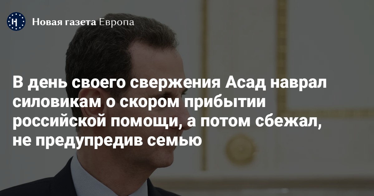 Бывший президент Сирии Башар Асад в день своего свержения собрал совещание с 30 руководителями армии и служб безопасности, чтобы соврать им о том, что российская помощь скоро придет к нему на помощь, и призвать держать оборону. Об этом пишет Reuters cо ссылкой на более 10 осведомленных источников.