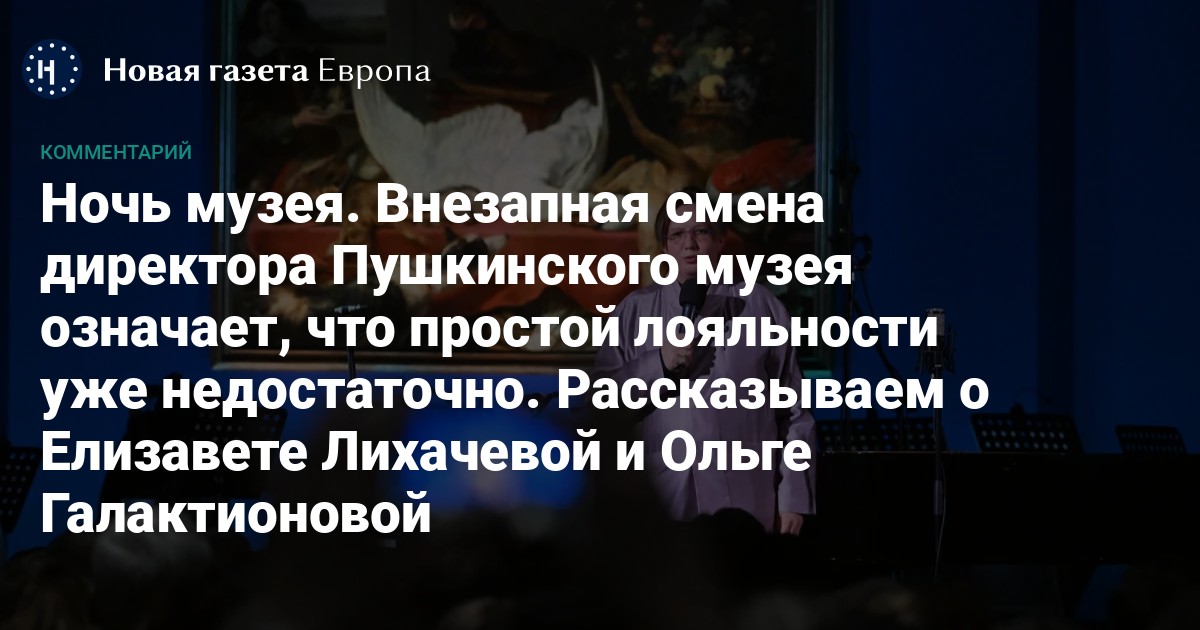 Вечером 16-го января появилась новость об отставке Елизаветы Лихачевой с поста директора Пушкинского музея. На ее место назначили Ольгу Галактионову, которая в последние годы ярко возглавляла «РОСИЗО». Замена стала неожиданной как для сотрудников институций, так, судя по всему, и для главных героинь (по крайней мере, для самой Лихачевой). Официальные причины увольнения озвучены не были, но сомневаться в том, что они политические, не приходится. Искусствовед Сорин Брут считает, что в лице Лихачевой и Галактионовой столкнулись два типа руководителей культуры, один из которых для власти нежелателен, а другой, напротив, крайне востребован. Рассказываем о фигурах двух директоров Пушкинского и разбираемся в причинах отставки.