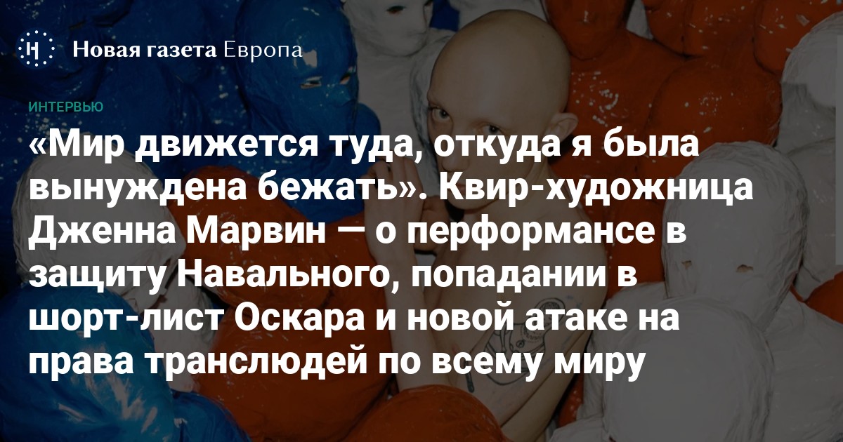 Дженна Марвин — одна из самых ярких российских художниц-акционисток, квир-активистка и модель Рика Оуэнса, открывающая его последние показы. Она родилась в Магадане, работала в Санкт-Петербурге и Москве и занималась политическим акционизмом, в частности вышла на акцию в поддержку Алексея Навального в 2021 году в скотче из цветов триколора, а в конце февраля 2022 года прошла по улицам Москвы, обмотанная колючей проволокой. После заведенного на нее административного дела она покинула страну и теперь проживает во Франции.