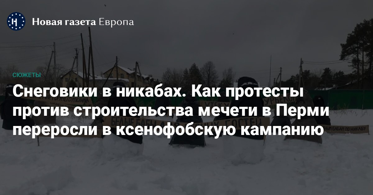 В феврале жители Перми вышли на протест против строительства мечети. Вместо традиционных лозунгов они слепили снеговиков и одели их в никабы, повесив на них исламофобские плакаты.