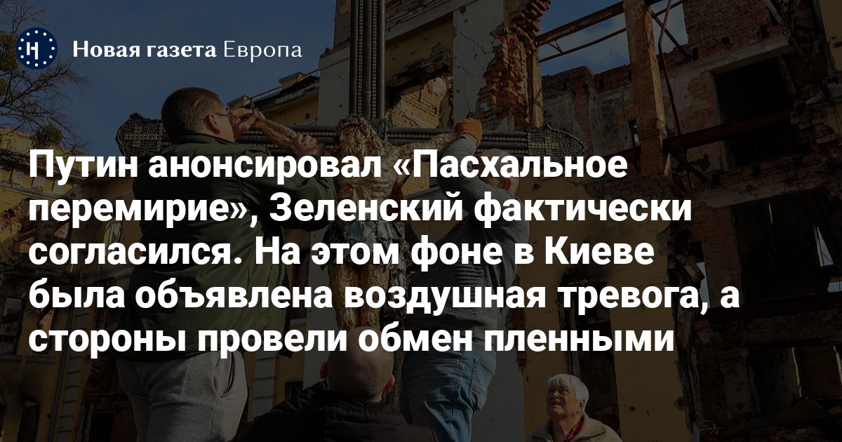 Сразу после того, как Владимир Путин заявил о Пасхальном перемирии, в Киеве и Киевской области объявлена воздушная тревога. Регион находится под атакой дронов, работает ПВО, сообщила местная военная администрация.
