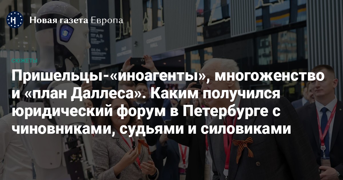 Петербургский международный юридический форум, который проходит с 19 по 21 мая, упоминается в соцсетях и попадает в новости исключительно из-за треш-дискуссий с участием российских чиновников и депутатов. На секциях о праве всерьез обсуждали теории заговора вокруг «плана Даллеса» и Ротшильдов, Александр Бастрыкин смеялся над протестным лозунгом «Россия будет свободной», а статус «иностранного агента» обещали давать даже инопланетянам.