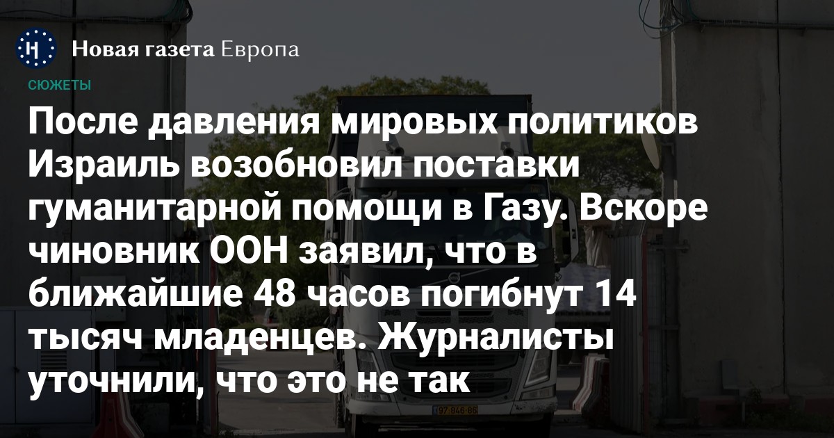 В понедельник, 19 мая, премьер-министр Израиля Биньямин Нетаньяху объявил о частичной отмене блокады поставок гуманитарной помощи в сектор Газа, продолжавшейся 11 недель. Координатор чрезвычайной помощи ООН Том Флетчер назвал это «каплей в море», а в эфире «Би-би-си» заявил, что «14 тысяч младенцев умрут в ближайшие 48 часов», если грузовики с гуманитарной помощью не доберутся до общин в секторе. Журналисты издания позже указали на аналитический отчет, опубликованный ранее в этом месяце, в котором говорится, что 14 тысяч тяжелых случаев среди голодающих детей могут быть зафиксированы в течение следующих 11 месяцев.