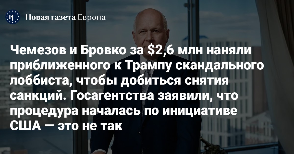 Глава «Ростеха» Сергей Чемезов и директор госкорпорации по особым поручениям Василий Бровко наняли юристов для консультирования по вопросам снятия санкций США. Это следует из договора, опубликованного в американском реестре иностранных агентов.