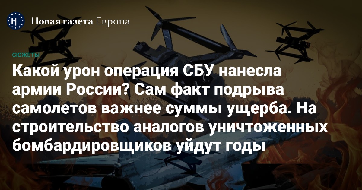 Подробнее о том, как на сегодняшний день оцениваются результаты украинской операции «Паутина», — в материале «Новой газеты Европа».