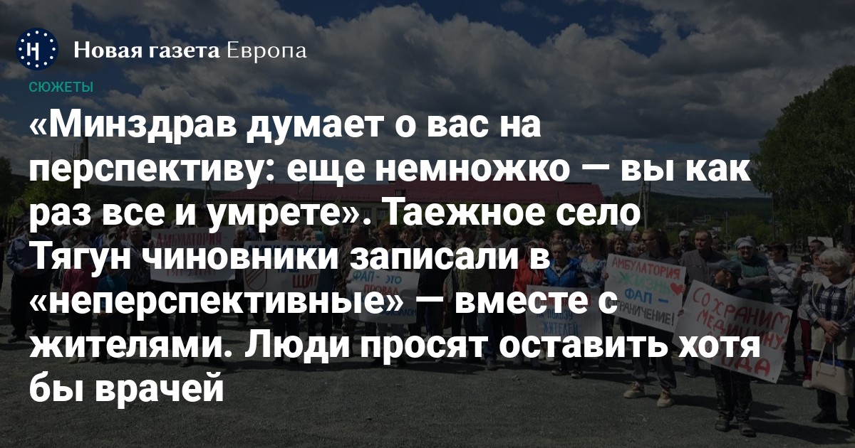 31 мая в селе Тягун Алтайского края прошла масштабная — даже по городским меркам — акция протеста. Три сотни человек — треть населения села — вышли к местному Дому культуры и потребовали сохранить амбулаторию — единственное место, куда люди пока еще могут обратиться за медицинской помощью.
