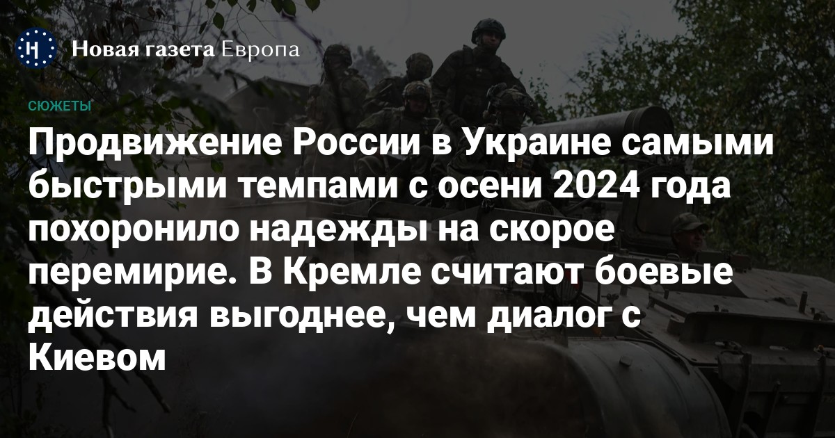 Продвижение России в Украине самыми быстрыми темпами с осени 2024 года похоронило надежды на скорое перемирие. В Кремле считают боевые действия выгоднее, чем диалог с Киевом