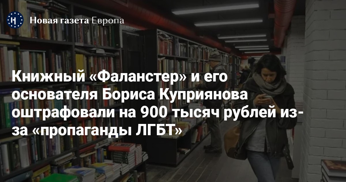 Тверской районный суд Москвы оштрафовал книжный магазин «Фаланстер» на 800 тысяч рублей, а его основателя Бориса Куприянова — на 100 тысяч рублей по статье о «пропаганде ЛГБТ» (ст. 6.21 КоАП), пишет «Медиазона».