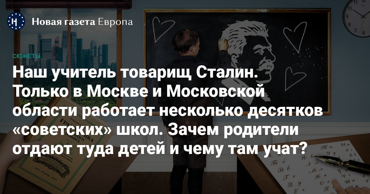 В противовес современной политике в «советских школах» много внимания уделяется личности Сталина. В некоторых школах учителя вешают его портрет над доской, где в государственных образовательных учреждениях обычно висит фотография Владимира Путина. Другие школы 21 декабря (день рождения Сталина. Прим. ред.) пишут посты с поздравлениями в адрес советского вождя. А химкинская школа «Артель» на своем Youtube-канале публикует лекции учителя истории об эффективности сталинской экономики.