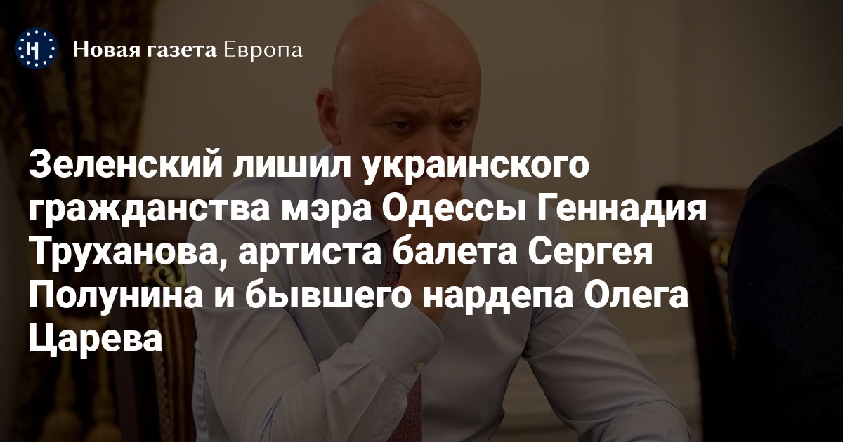 Президент Украины Владимир Зеленский подписал указ о лишении гражданства мэра Одессы Геннадия Труханова, артиста балета Сергея Полунина и бывшего народного депутата от «Партии регионов», а ныне Z-блогера Олега Царева. Об этом сообщили в эфире украинского телемарафона.