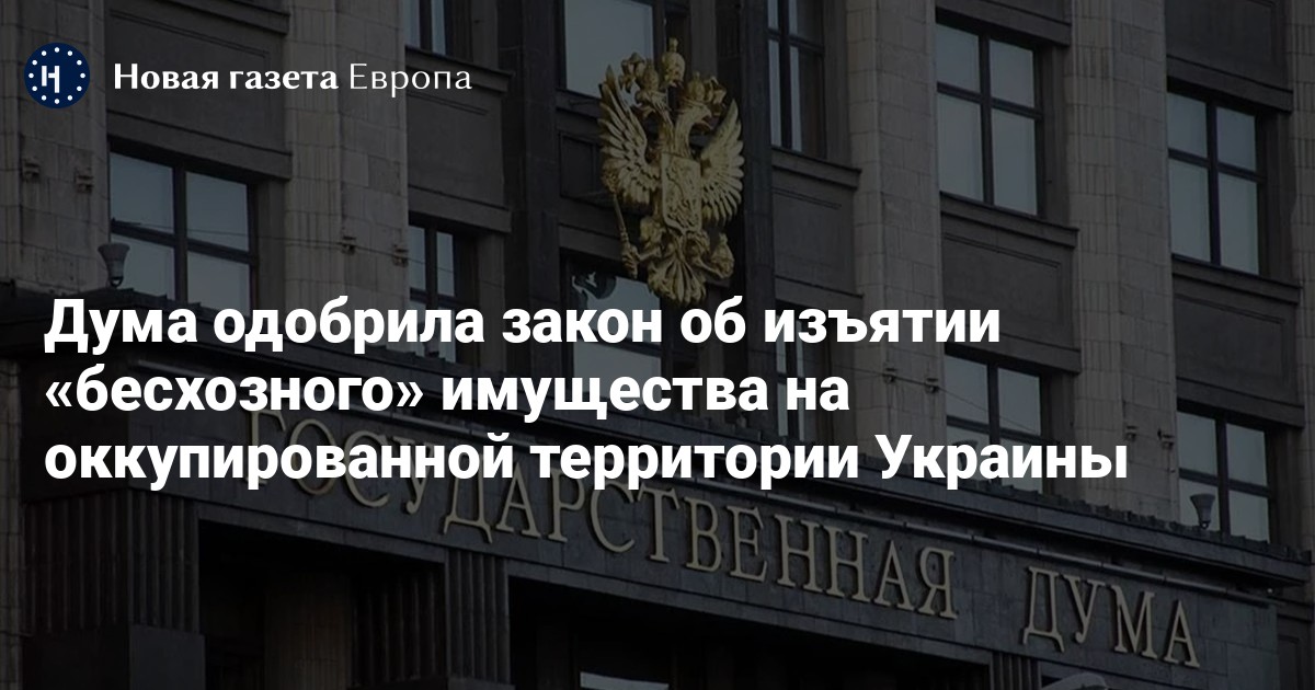 Госдума в первом чтении одобрила законопроект, который позволит изымать в госсобственность жилье на территории оккупированных частей Донецкой, Луганской, Херсонской и Запорожской областей, если российские власти признают «бесхозяйным». Об этом пишет ТАСС.