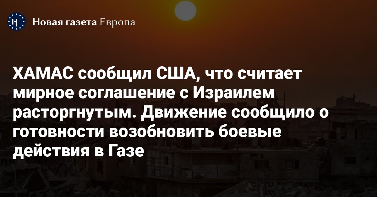 ХАМАС уведомил американскую сторону, что считает мирное соглашение с Израилем расторгнутым из-за систематических нарушений со стороны ЦАХАЛ. Движение заявило о готовности начать боевые действия в Газе, сообщает телеканал Al Hadath со ссылкой на источники.