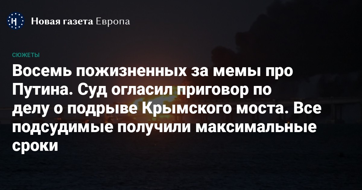В Южном окружном военном суде в Ростове-на-Дону закончился процесс по делу о подрыве Крымского моста 8 октября 2022 года. Прокурор запросил пожизненное лишение свободы всем восьми подсудимым: им вменяют подготовку теракта и незаконную перевозку взрывчатки. Приговор будет оглашен 27 ноября.