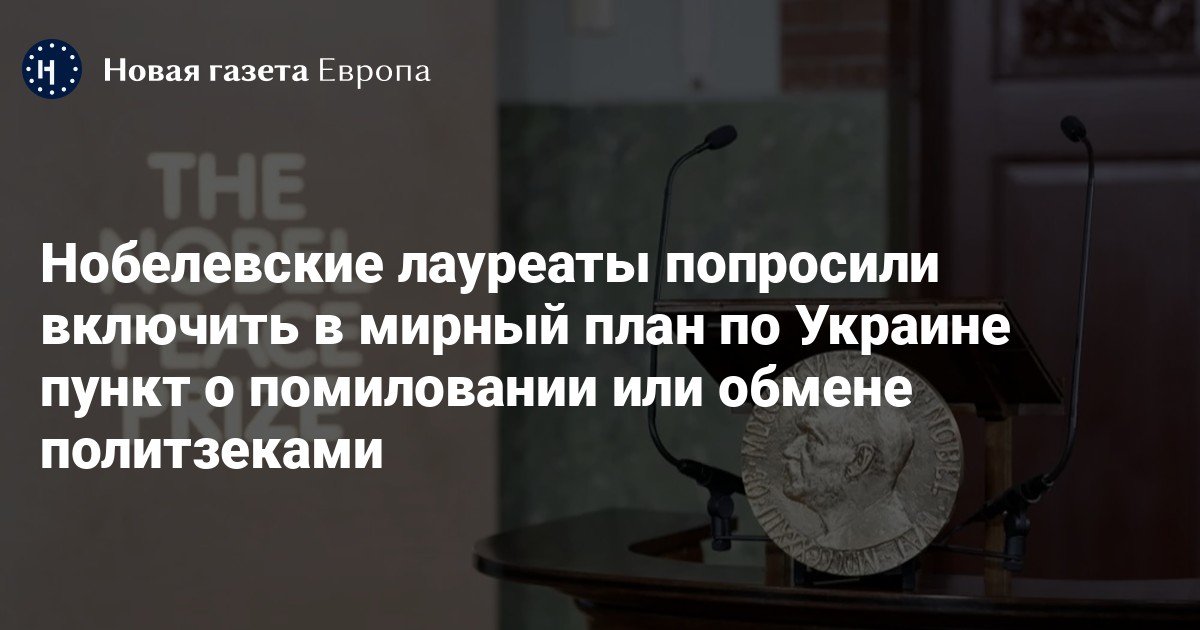 Нобелевские лауреаты обратились к Владимиру Путину, президенту Украины Владимиру Зеленскому и представителям стран ЕС с просьбой включить в мирный план пункт о помиловании или обмене политзеками. Об этом сообщает Deutsche Welle со ссылкой на соответствующее письмо.