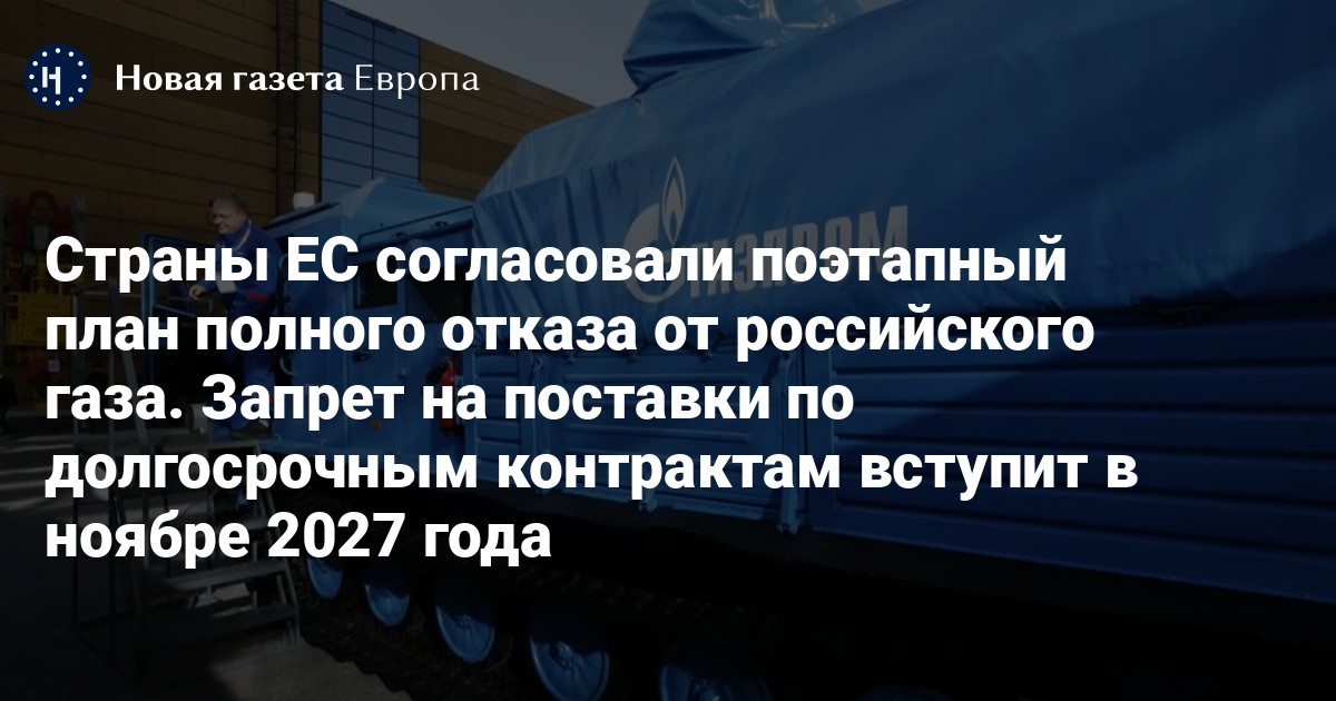 Предполагается, что полный запрет на долгосрочные контракты на поставки российского газа в ЕС по трубопроводам вступит в силу 1 ноября 2027 года. Ограничения на поставки сжиженного природного газа (СПГ) начнут действовать с 1 января 2027 года.
